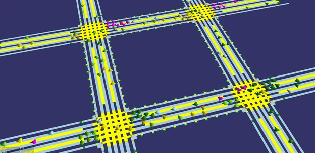 Current industry-level transportation simulation models are multi-modal, but pedestrian behaviour is neglected and simplified in favour of a well-developed automobile model. As a result, simulation results and data are not as accurate as they have the potential to be. The purpose of this design thesis project is to address this issue by investigating the potential of developing a multi-modal transportation simulation model using Oasys MassMotion, an advanced pedestrian simulation model. Namely, the investigation is directed at expanding MassMotion’s functionality to move from a building-scale environment to a neighbourhood-scale environment, and from incorporating only pedestrian agents to incorporating both automobile and pedestrian agents in the simulation. The development of a proof-of-concept model was broken down into three steps: a pedestrian-only design in a city block environment, an automobile-only design in a city block environment, and an integrated, multi-modal design in a city block environment. The proof-of-concept was successful in demonstrating MassMotion’s potential for further development, and further development is recommended. However, there are numerous further developments that must be made before MassMotion can be used as a fully-functional, accurate transportation model.